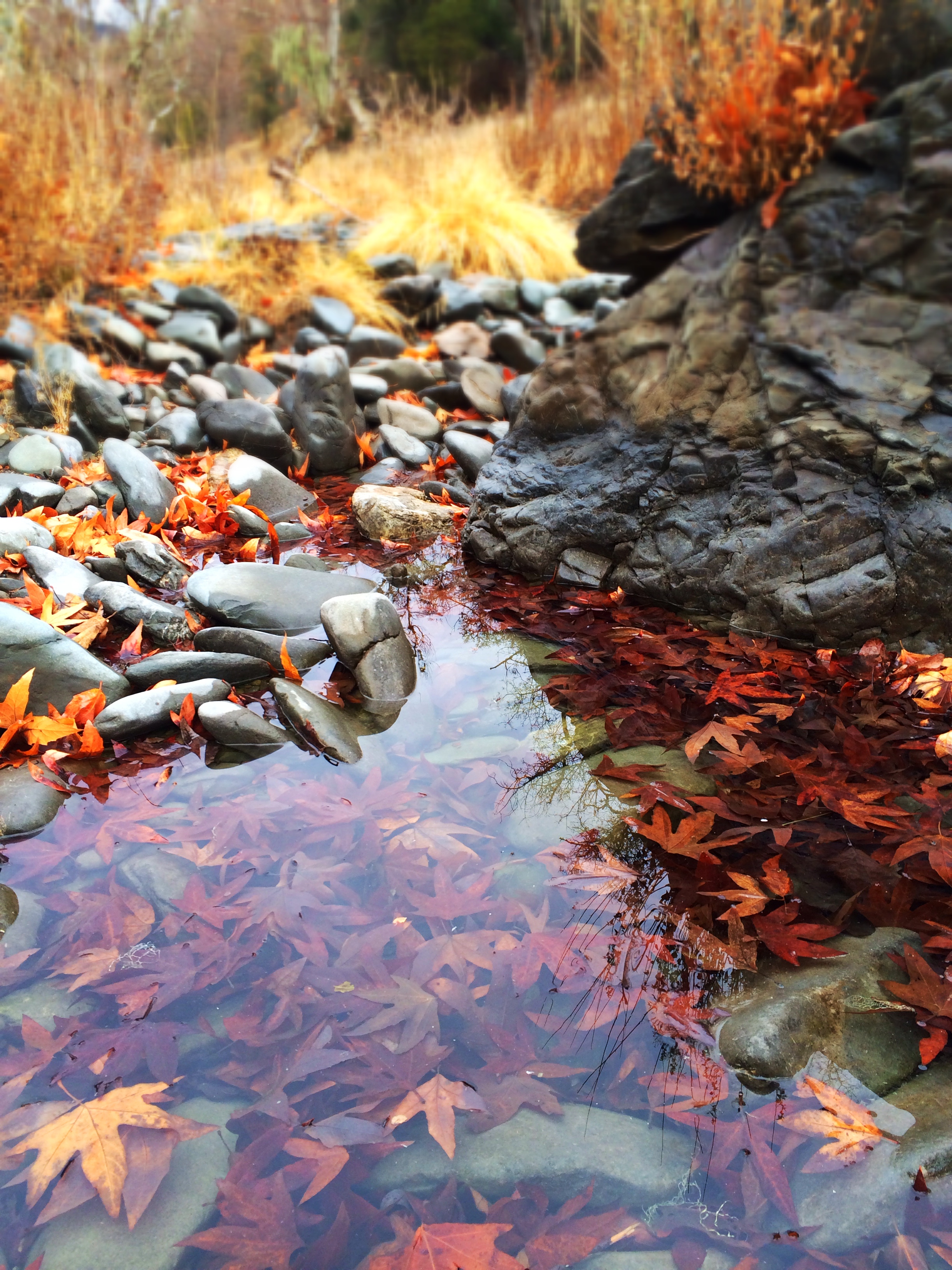 As quickly as the snow started, the rain stops, and I find myself in China Basin. A river runs through the basin, but this time of year the water doesn’t seem to be moving. There are many still, crystal clear pools, lined with dry grass and trees wrapped in mossy coats. Rising from the water are jagged grey rocks streaked with white veins. The area nearly looks like a manicured garden. My morale returns as my clothes dry and I venture further. I decide this is a perfect place for lunch.