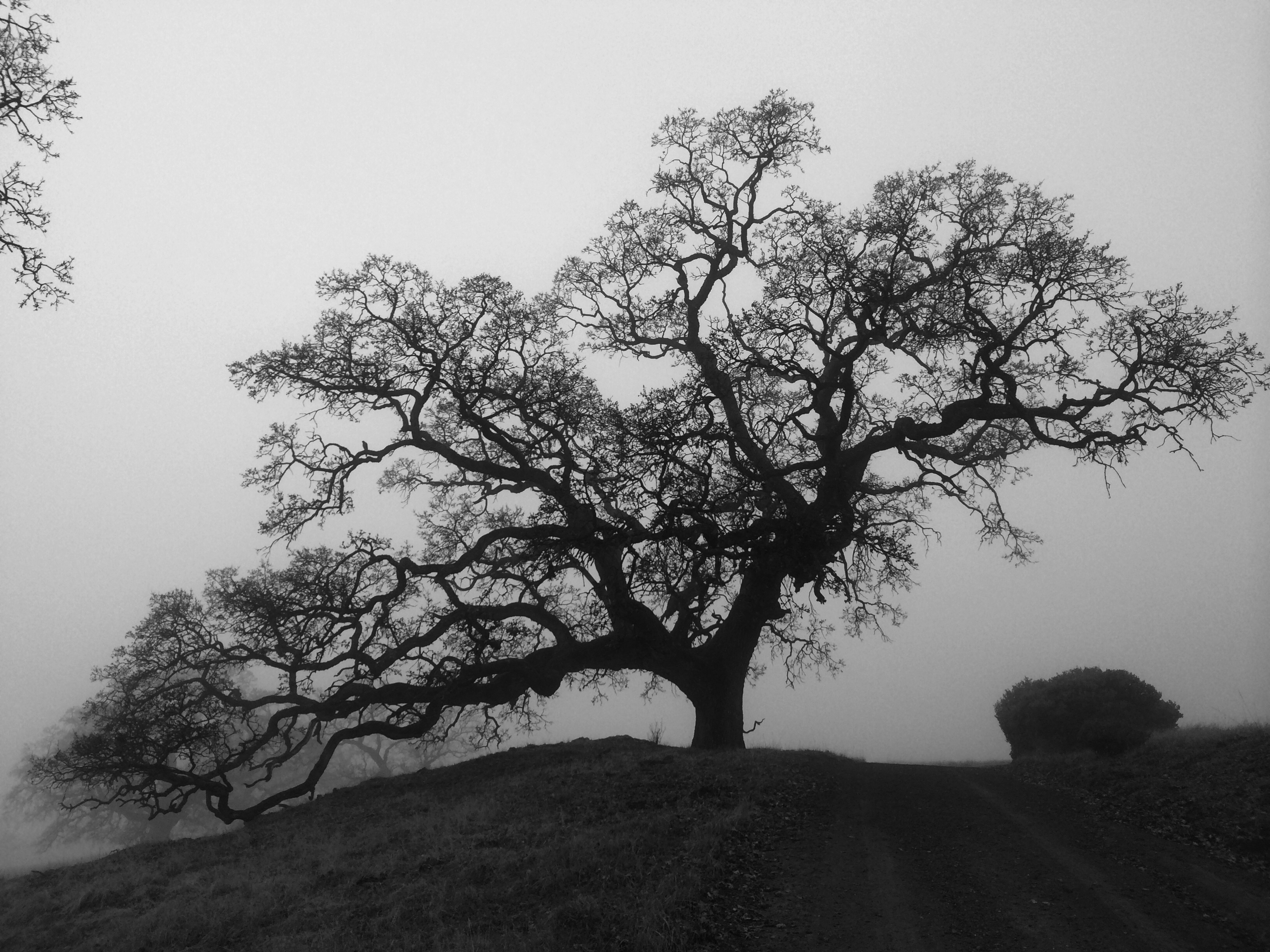 I finish eating and gazing in the pools and continue on. I head up hopefully the last ridge through more manzanita trees than I’ve ever seen. Some of the trees are burned creating a stark contrast with their bright smooth red bark. At the top of the ridge the scenery changes, and I walk by naked oak trees blanketed in an eerie fog. I feel I’m getting closer to the ranger station as more people appear in the fog.