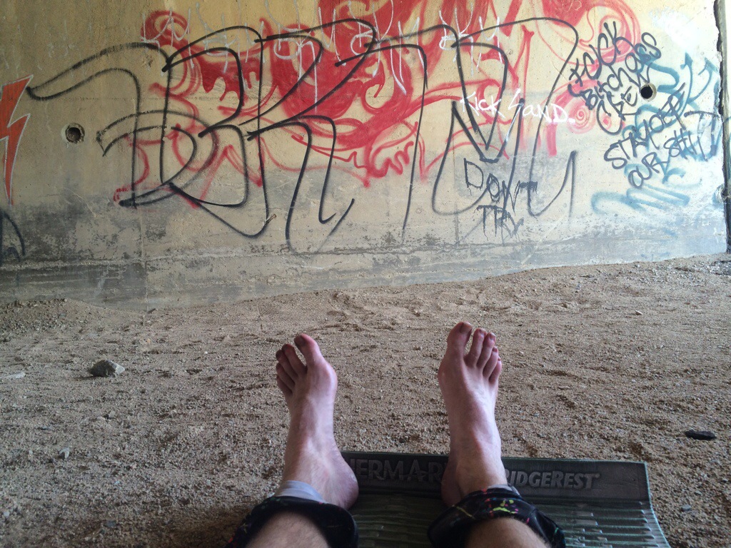 Day 34 Jun 1, 2014 • Brendan Dahl Day 34 5/17 Mile mark 558.5-570.8 Tehachapi to ? Still alive! I haven’t had cell service for two weeks though. Tent Stake performs her excited to hike dance. More wind farms. I’m really sick of the wind and the farms. Resting under a bridge.