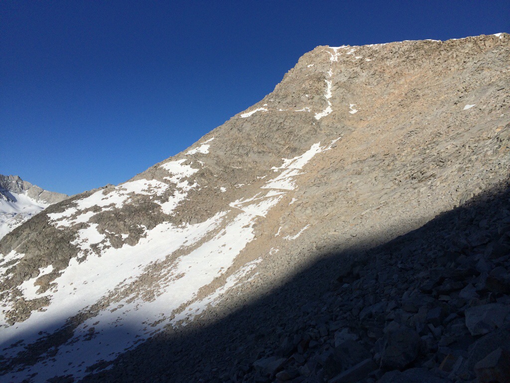 At 6am, we’re all packed up and moving. The trail at first is easy to follow, but it soon disappears under its winter blanket of snow. We then have to resort to scrambling over boulders and snow fields and guessing where the trail goes. Half way up the pass, the trail shows itself again as prominent zig zags straight up the side of the mountain.