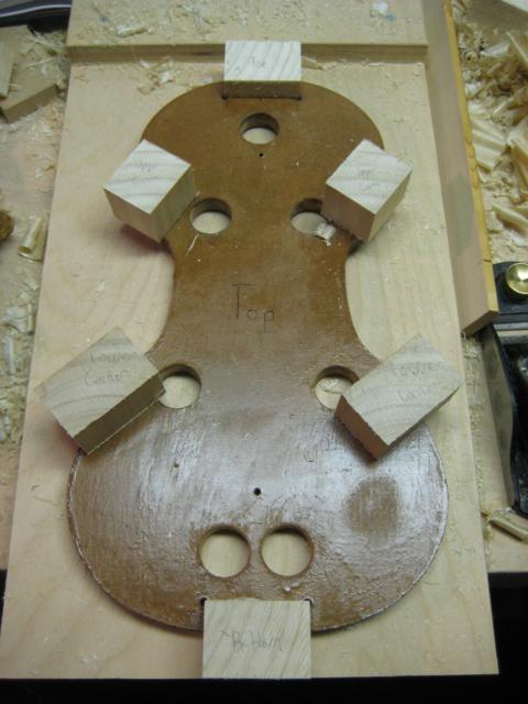 For the insides of the corner blocks I first trimmed them close to size and then used a sanding drum on my drill press. At first this was incredibly slow and tedious, but then I switched from the sand paper the drums came with to some nicer stuff and it went much quicker. On my next violin I’d like to try using an in-channel gouge, but I’ve already spent too much money, so I decided to use the tools at hand.