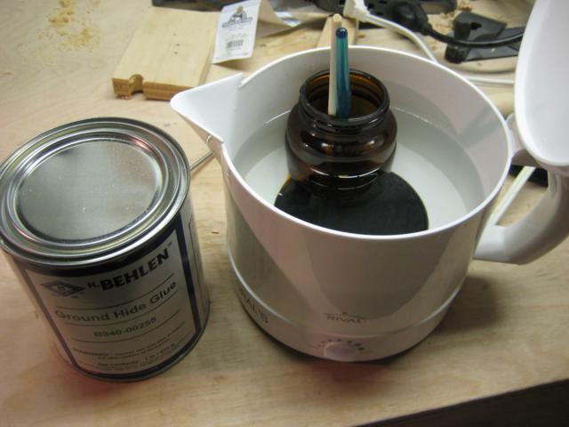 This was my first time ever working with hide glue. Hide glue requires you to heat it up to a specific temperature before use. Instead of spending $100 on a real glue pot, I went to the Portland Goodwill Outlet (“the bins”) and bought a water boiling pot for $1.25. “The bins” is worthy of its own story, but I’ll save that for another time.