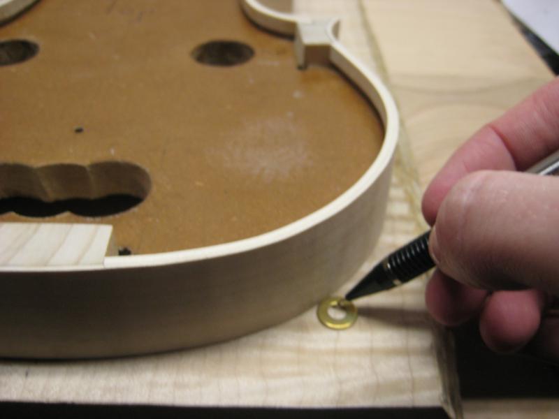 To trace the shape of the violin, I drilled tiny holes in the upper and lower blocks and also into the back of the violin. Small pins can then be inserted to ensure everything stays aligned.