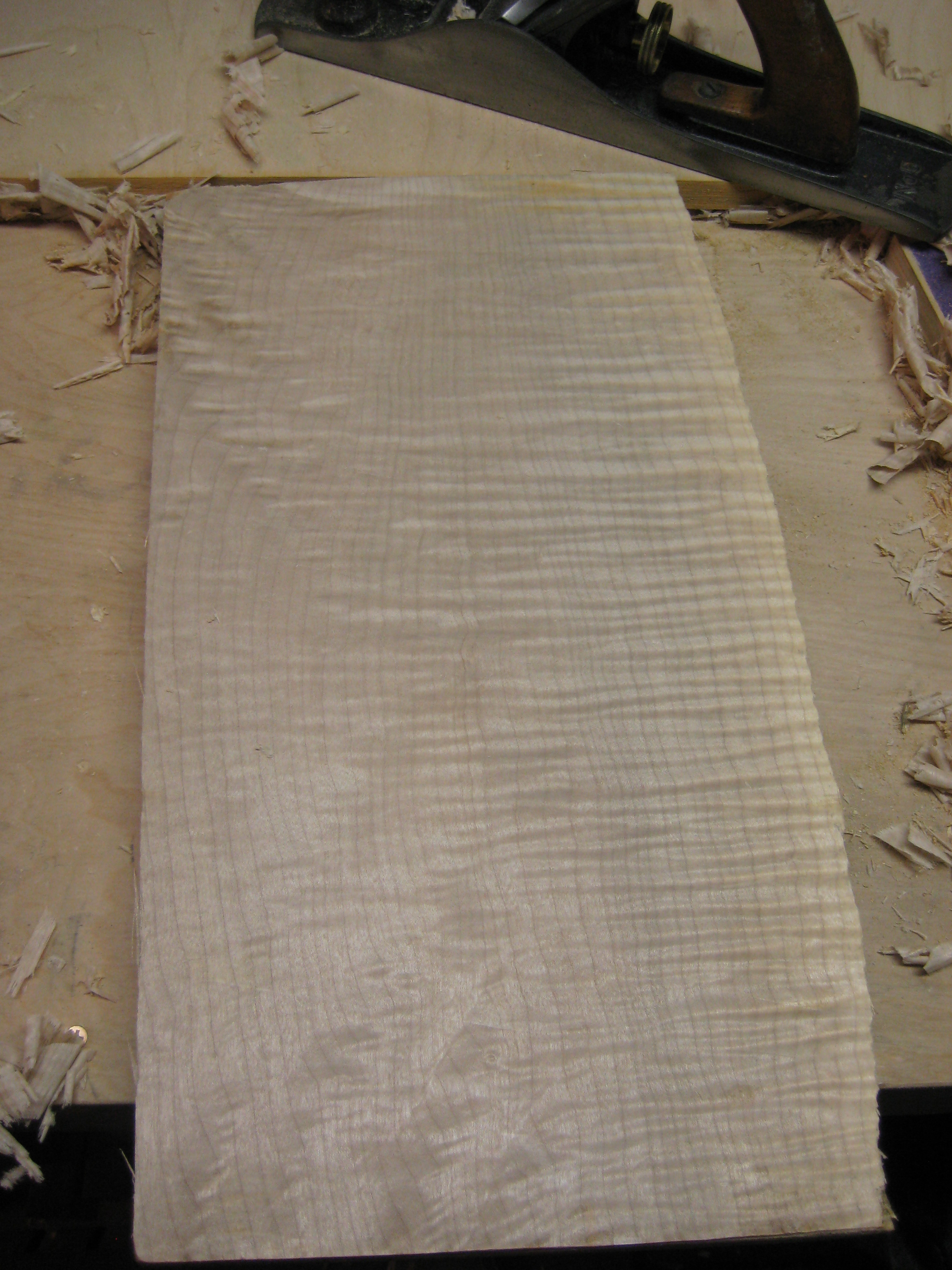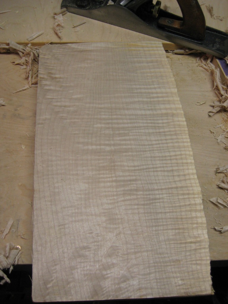The back of the violin is traditionally made of maple. More commonly the back is also made of a piece that is cut in half and then opened like a book and joined in the middle to create a “book matched” joint. However, my piece of maple is large enough to use as a single piece back. As seen below the maple is highly figured (flamed). First, I started by planing the wood and getting it roughly flat.