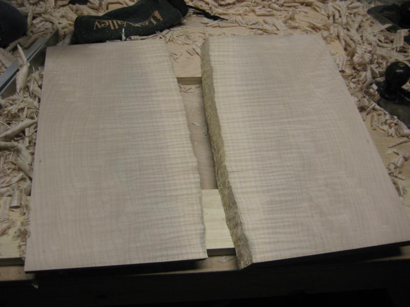 The back was thick enough that a fair amount of wood would have been wasted getting it to the initial thickness, so I took it to the bandsaw and re-sawed it. Now there’s an extra piece of very pretty maple for another project.