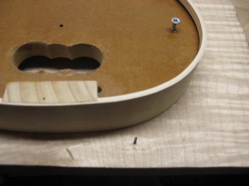To trace the shape of the violin, I drilled tiny holes in the upper and lower blocks and also into the back of the violin. Small pins can then be inserted to ensure everything stays aligned.